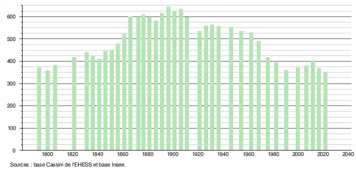 L'évolution du nombre d'habitants est connue à travers les recensements de la population effectués dans la commune depuis 1793. Pour les communes de moins de 10 000 habitants, une enquête de recensement portant sur toute la population est réalisée tous les cinq ans, les populations légales des années intermédiaires étant quant à elles estimées par interpolation ou extrapolation[23]. Pour la commune, le premier recensement exhaustif entrant dans le cadre du nouveau dispositif a été réalisé en 2006[24].