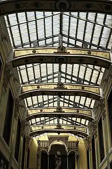 Le passage se divise en deux galeries qui convergent en une rotonde couverte d'une coupole en verre. Le toit des galeries est une construction de fer et de verre soutenue par des poutres en bois richement décorées de stuc et peintes de motifs végétaux. Le verre provenait de la fabrique royale de cristal de la Granja située à San Ildefonso dans la Province de Ségovie en Castille-et-León. Dès le début, le passage était équipé d'un éclairage au gaz, une nouveauté à l'époque.