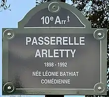 D'abord dénommée passerelle de la Grange-aux-Belles, du nom de la rue qui y conduit, elle a été renommée, en 2022, du nom d'Arletty (1898-1992)[2], comédienne française notamment connue pour son rôle dans le film Hôtel du Nord de Marcel Carné, au cours duquel, sur les bords du canal Saint-Martin, elle prononce la fameuse réplique « Atmosphère ! Atmosphère ! Est-ce que j'ai une gueule d'atmosphère ? ». L'inauguration s'est déroulée le [3].