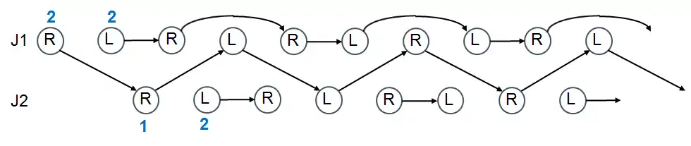 - J1 démarre en en premier: J1 envoie une passe en double (haute, équivalent de 4.5 temps) de sa main droite vers la main gauche de J2 (passe droite).