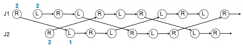 - J2 commence 1 temps 1/2 après la passe de J1 (il attend le plus longtemps possible) :