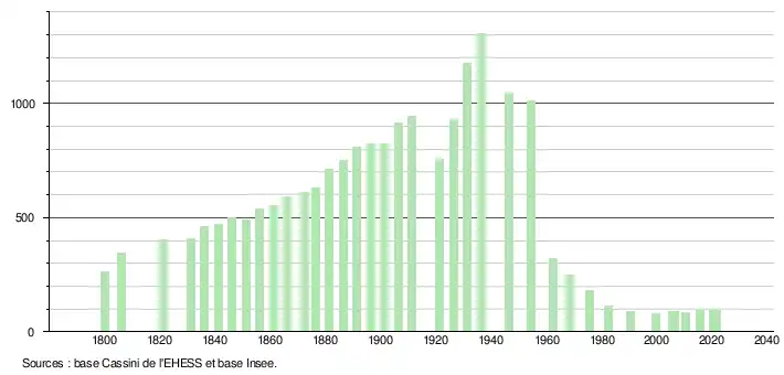 L'évolution du nombre d'habitants est connue à travers les recensements de la population effectués dans la commune depuis 1800. Pour les communes de moins de 10 000 habitants, une enquête de recensement portant sur toute la population est réalisée tous les cinq ans, les populations légales des années intermédiaires étant quant à elles estimées par interpolation ou extrapolation[8]. Pour la commune, le premier recensement exhaustif entrant dans le cadre du nouveau dispositif a été réalisé en 2005[9].