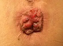 Les hémorroïdes sont asymptomatiques dans plus de la moitié des cas[12]. Les symptômes sont essentiellement l'hémorragie (typiquement après une défécation), la douleur, la gêne locale, le suintement (10 % des cas[13]) ou le prurit[1],[2]. Ils ne sont pas spécifiques et peuvent se voir dans d'autres maladies anales. L'aggravation des symptômes en cas d'ingestion d'épices n'a pas été scientifiquement démontrée[14].