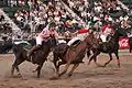La circonférence est l'élément caractéristique du canard, et c'est excitant. Deux cavaliers montent à toute vitesse, chacun prenant le canard par une poignée; par des secousses propres, ils essaient de s'emparer du canard. Notez que celui qui "offre" fait toujours des sangles avec sa main droite; la main qui ne serre pas doit tenir les rênes. Pendant le serrage, il est interdit de s'appuyer sur la chaise. Le canard nécessite un cheval entraîné et une grande agilité de la part du cavalier pour ramasser, sangler, gifler et convertir.