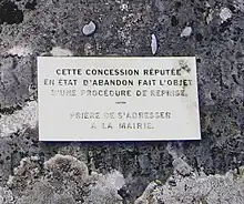 En France, certains se plaignent de ce que l'administration des cimetières — même ceux des petits cimetières ruraux ne manquant pas de place — multiplient depuis les années 2000-2004 les « petits écriteaux sur lesquels on peut lire : "Cette concession réputée en état d'abandon fait l'objet d'une procédure de reprise par la mairie." »[3].