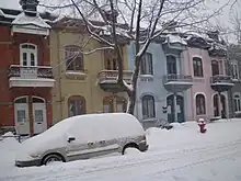 Particulièrement typiques, les maisons en rangée font leur apparition vers les années 1860 dans le but d'héberger les familles d'ouvriers affectés aux grand travaux. D'apparence identique, elles se succèdent, séparées par un mur coupe-feu intérieur. D'abord à toit à pignon mansardé, elles intègrent le toit plat à partir de 1885, surtout par souci d'économie. Ces toits sont recouverts de papier goudronné qui vient de faire son apparition et sont légèrement inclinés pour permettre l'écoulement de l'eau par un conduit intérieur. Elles sont à deux ou trois étages, dotés alors d'un escalier extérieur.