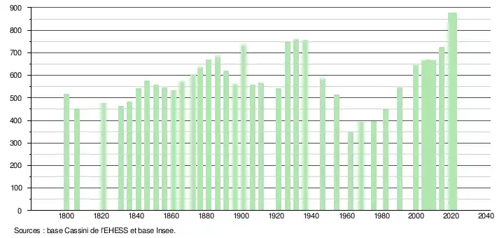 - Population municipale légale en vigueur au 1er janvier 2024, millésimée 2021, définie dans les limites territoriales en vigueur au 1er janvier 2023, date de référence statistique : 1er janvier 2021.