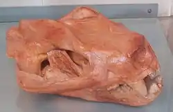Son crâne est assez massif, d'une longueur d'environ 25 centimètres. La région occipitale est caractérisée par de grandes crêtes pour l'insertion des muscles. De même les arcs zygomatiques étaient particulièrement puissants et élargis. La mâchoire est courte et puissante avec des incisives réduites, tandis que les canines sont très grandes et massives, les prémolaires supérieures avaient un denticule interne remarquable. La troisième molaire supérieure a disparu. La carnassière supérieure a la forme d’une lame coupante, tandis que l'inférieure est dépourvue de métaconide et comporte un talonide rudimentaire.