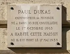 Paul Dukas, né le dans le 1er arrondissement de Paris[2] et mort le dans le 16e arrondissement de la même ville[3], est un compositeur français. Perfectionniste et exigeant, il abandonna nombre de ses projets musicaux et ne publia qu'une poignée de ses œuvres. Il est connu pour son poème symphonique L'Apprenti sorcier, dont la popularité éclipsa ses autres œuvres, parmi lesquelles figurent son opéra Ariane et Barbe-Bleue, une symphonie, une sonate pour piano et un ballet, La Péri. Il fut aussi critique musical, et devint professeur de composition au Conservatoire de Paris et à l'École normale de musique vers la fin de sa vie.