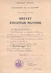 Le il passe son brevet de pilote militaire (No 2611) au Bourget en une seule épreuve - il a déjà réalisé des missions opérationnelles -: une heure de vol à 2000 mètres d’altitude ainsi que l'atteste une bande barométrique dans son dossier!