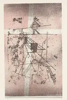 Mais, depuis 1922, les conflits se sont multipliés entre les dirigeants du Bauhaus, notamment entre Johannes Itten et Gropius[37]. Ce qui n'empêche pas Klee de continuer à produire, à exposer et à enseigner. Il publie entre autres « L'Étude de la nature », dans le recueil Le Bauhaus de Weimar[39].