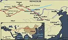 La plus fameuse de ces missions est celle de 1906 à 1908 dans le Turkestan chinois [15]: parti en train de Paris le pour Saint-Pétersbourg avec deux compagnons de voyage, le docteur Louis Vaillant [16] et le photographe Charles Nouette [17]. Pelliot retrouve fin juillet 1906, suivant les ordres militaires, à Boukhara, le colonel finlandais Gustaf Mannerheim, officier de l'armée impériale russe, en mission d'espionnage pour le Tsar Nicolas II, lequel avait des visées territoriales sur l'ouest chinois[18],[19]. Associés pendant trois mois, leur route se sépare fin octobre 1906 à Kashgar.