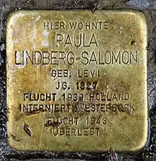 Le nom original de Paula Salomon-Lindberg est Paula Levi[2]. Son père est Lazarus Levi, juif Religionslehrer (de) et hazzan, qui avait une réputation particulière en tant que chanteur, bien au-delà de la ville de Frankenthal. Il est né le à Eckardroth et s'établit à Frankenthal en 1896, qui, à l'époque, appartenait à la Bavière. Le , il épouse Sophia Mayer, née à Frankenthal le . Le seul enfant issu du mariage est leur fille Paula. Lazarus Levi meurt le et sa femme, le , tous deux morts à Frankenthal. Leur tombe, au nouveau cimetière juif de Frankenthal, est toujours préservée aujourd'hui[3],[4].