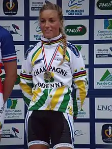 Le , jour de son succès en VTT, elle devient la première Française à cumuler quatre titres nationaux lors d'une même saison (course en ligne sur route, contre-la-montre, cyclo-cross et VTT)[37]. Elle compte également deux victoires sur des manches élites de la Coupe du monde de VTT, alors qu'elle pourrait concourir chez les espoirs. Elle se classe finalement dixième de la Coupe du monde de VTT. Après un titre au championnat d'Europe de VTT espoirs (devant la Suissesse Jolanda Neff) et un premier titre mondial sur le relais mixte, elle est annoncée comme la favorite du championnat du monde de cross-country espoirs. Cependant, victime de deux bris de chaîne, elle doit se contenter de la huitième place[38].