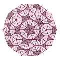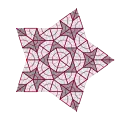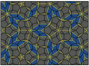 Le pavage construit autour de pentagones, P1, est en fait le premier découvert par Penrose, qui s'est inspiré d'abord des recherches de Johannes Kepler[7]. Il est bien connu qu'on ne peut couvrir le plan avec des pentagones réguliers, mais trois autres pièces suffisent pour combler les interstices, tout en imposant l'ordre apériodique. Ces pièces sont un losange fin, un pentagramme et un « bateau », qui représente à peu près les 3/5 d'un pentagramme. Pour la construction directe du pavage apériodique, il faut aussi distinguer trois sortes de pentagones. Une solution bien plus simple consiste à esquisser des pentagones sur les losanges fins et gros qu'on arrange en pavage de type 3.
