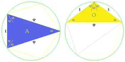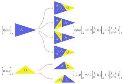 - Tout triangle d'or obtus (O) de dimensions [1 ; 1 ; φ] peut se décomposer (de deux façons différentes et symétriques) en deux triangles : un triangle d'or aigu [1/φ ; 1 ; 1] et un triangle d'or obtus [1/φ ; 1/φ ; 1].