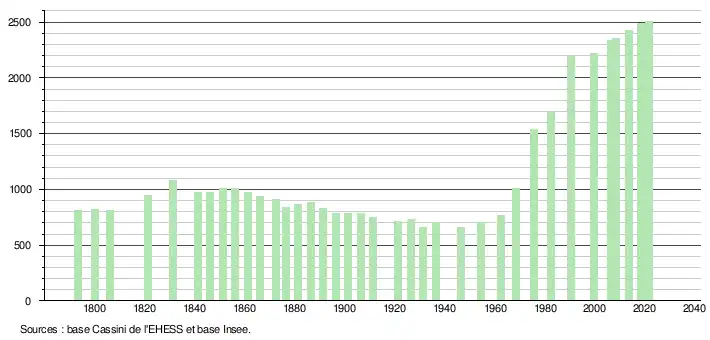 | L'évolution du nombre d'habitants est connue à travers les recensements de la population effectués dans la commune depuis 1793. Pour les communes de moins de 10 000 habitants, une enquête de recensement portant sur toute la population est réalisée tous les cinq ans, les populations légales des années intermédiaires étant quant à elles estimées par interpolation ou extrapolation[32]. Pour la commune, le premier recensement exhaustif entrant dans le cadre du nouveau dispositif a été réalisé en 2008[33]. En 2021, la commune comptait 2 510 habitants[Note 5], en augmentation de 1,7 % par rapport à 2015 (Gers : +0,79 %, France hors Mayotte : +1,84 %). |