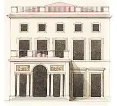 Le frontispice du bâtiment est orienté nord-sud. Le corps de logis compte deux étages, le dernier étage étant un attique bas de plafond. Les ailes sont sur un seul niveau, avec de part et d'autre cinq hautes fenêtres. Le toit est orné de balustrades.