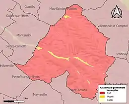 Le retrait-gonflement des sols argileux est susceptible d'engendrer des dommages importants aux bâtiments en cas d’alternance de périodes de sécheresse et de pluie. La totalité de la commune est en aléa moyen ou fort (75,2 % au niveau départemental et 48,5 % au niveau national). Sur les 124 bâtiments dénombrés sur la commune en 2019, 124 sont en aléa moyen ou fort, soit 100 %, à comparer aux 94 % au niveau départemental et 54 % au niveau national. Une cartographie de l'exposition du territoire national au retrait gonflement des sols argileux est disponible sur le site du BRGM[24],[Carte 3].
