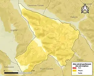 Le retrait-gonflement des sols argileux est susceptible d'engendrer des dommages importants aux bâtiments en cas d’alternance de périodes de sécheresse et de pluie. 90,7 % de la superficie communale est en aléa moyen ou fort (19,2 % au niveau départemental et 48,5 % au niveau national). Sur les 43 bâtiments dénombrés sur la commune en 2019, 40 sont en aléa moyen ou fort, soit 93 %, à comparer aux 17 % au niveau départemental et 54 % au niveau national. Une cartographie de l'exposition du territoire national au retrait gonflement des sols argileux est disponible sur le site du BRGM[19],[Carte 2].