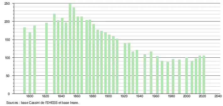 | L'évolution du nombre d'habitants est connue à travers les recensements de la population effectués dans la commune depuis 1793. Pour les communes de moins de 10 000 habitants, une enquête de recensement portant sur toute la population est réalisée tous les cinq ans, les populations légales des années intermédiaires étant quant à elles estimées par interpolation ou extrapolation[21]. Pour la commune, le premier recensement exhaustif entrant dans le cadre du nouveau dispositif a été réalisé en 2006[22]. En 2021, la commune comptait 106 habitants[Note 3], en stagnation par rapport à 2015 (Landes : +4,9 %, France hors Mayotte : +1,84 %). |