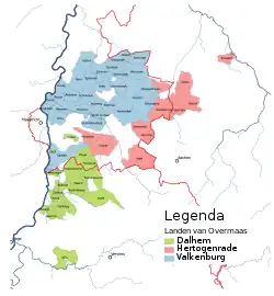 De cette manière, l'ensemble de ces quatre pays autonomes était considérée comme l'une des dix-sept provinces des Pays-Bas bourguignons et, plus tard, souvent désignée uniquement comme Limbourg et parfois aussi comme les (désormais) quatre pays d'Outre-Meuse. Selon une déclaration des États du Limbourg et d'Outre Meuse en 1600, les quatre capitales comptaient ensemble moins de 90 ménages[2].