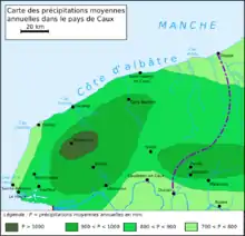 Les précipitations se répartissent tout au long de l’année, avec un maximum en automne et en hiver. Les mois de juin et juillet sont marqués par quelques orages[31] qui peuvent produire des crues catastrophiques dans les vallées. L’un des traits caractéristiques du pays de Caux est la grande variabilité du temps, même au cours d’une journée[32]. Les vents dominants soufflent du sud et du sud-ouest ; les tempêtes arrivent en hiver, surtout en janvier[31]. Le record absolu pour le pays de Caux a été enregistré le au Cap de la Hève : 180 km/h[29]. Enfin, il existe des microclimats liés à une situation particulière ; la côte nord (autour de Dieppe) est plus froide et humide que le reste du littoral[33]. L’intérieur du plateau de Caux possède une nuance flamande.