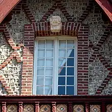 - Un motif ornemental en stuc apposé sur le linteau en briques de cette baie, simule une clef de voûte décorative.