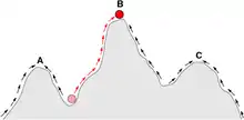 Le mouvement dans un paysage adaptatif représente le processus de l’évolution. Les organismes ou populations peuvent bouger à travers le paysage adaptatif selon les principes fondés sur la théorie « shifting-balance ». Ce serait donc la dérive génétique qui permet à une sous-population déjà adaptée, soit au sommet d’un pic, de descendre vers une vallée. Par ce processus, l’espèce devient mal adaptée à son environnement. En considérant uniquement la sélection naturelle, cela ne serait jamais possible. Une fois dans la vallée, la sous-population se dirige vers la base d’un pic encore plus haut que le précédent. Elle va ensuite commencer à grimper le pic par sélection naturelle[11]. Ici, chaque dimension décrit une fréquence allélique d'un gène différent, et se situe entre 0 et 1.