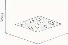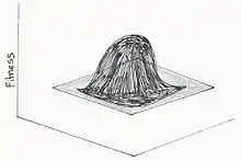 Le paysage adaptatif est représenté sur deux axes. L’axe vertical représente la valeur de fitness. Si l’axe vertical représente la fitness des organismes, l’axe horizontal peut représenter soit le génotype soit le phénotype de ceux-ci. Si l’axe vertical représente plutôt la fitness des populations, l’axe horizontal représente alors la fréquence d’allèles ou de certains traits phénotypiques. Les génotypes similaires entre eux sont dits "proches" les uns des autres, alors que ceux qui sont très différents sont "éloignés" les uns des autres. L'ensemble de tous les génotypes possibles, leur degré de similarité et leurs valeurs de fitness associées est appelé un paysage adaptatif. L'idée d'un tel paysage est une métaphore aidant à expliquer les "formes imparfaites" issues de la sélection naturelle au cours de l'évolution, y compris les "améliorations" et les "déformations" chez les animaux comme leurs réactions aux stimuli supranormaux[2].