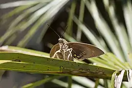 L’espèce se nymphose dans un cocon en incorporant des fibres de palmier à l’intérieur de la galerie larvaire.