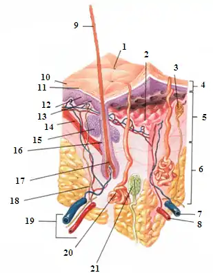 - une couche plus profonde, l’hypoderme, qui n’est classiquement pas assimilée à une couche de peau (6 sur le diagramme).