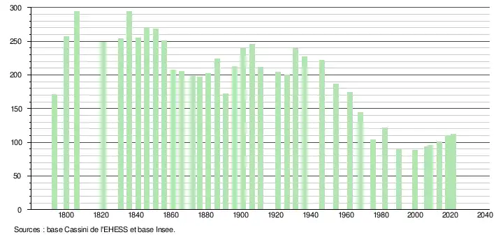 L'évolution du nombre d'habitants est connue à travers les recensements de la population effectués dans la commune depuis 1793. Pour les communes de moins de 10 000 habitants, une enquête de recensement portant sur toute la population est réalisée tous les cinq ans, les populations légales des années intermédiaires étant quant à elles estimées par interpolation ou extrapolation[24]. Pour la commune, le premier recensement exhaustif entrant dans le cadre du nouveau dispositif a été réalisé en 2008[25].