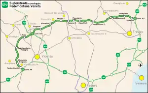 La Superstrada Pedemontana Veneta est une voie rapide séparée par un terre-plein central (annoncée par les panneaux d'autoroutes vert) appartenant à la région de Vénétie en concession de péage. Elle n'a pas de classification alphanumérique comme les autres autoroutes italiennes, mais est identifiée par l'abréviation SPV.