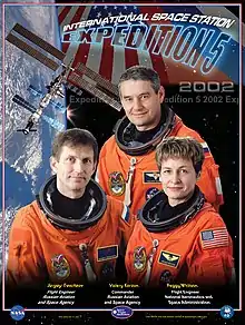 Peggy Whitson réalise une première mission à bord de la station spatiale internationale (ISS) en tant que membre de l'Expédition 5. Sa mission débute le , à bord du vol STS-111 qui s'amarra à l'ISS. Elle retourne sur Terre via le vol STS-113, le .