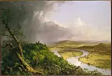 Le Nouveau Monde a eu ses peintres au XIXe siècle qui déployèrent leur talent à dresser une image glorieuse de ses paysages, emplis de pittoresque et de sublime. Dès les années 1830, Thomas Cole (1801-1848) et son groupe de l'Hudson River School dressent des images grandioses d'un espace composite : nature inviolée et nature cultivée, sur de vastes formats[38]. Il souhaite ainsi créer une vision, politique de la nouvelle société américaine, dans son milieu de vie, divisé entre sauvage et pastoral.
