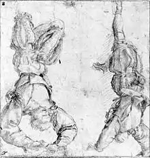 - Niccolò Piccinino fut représenté dans les fers, pendu la tête en bas, dans le Palazzo della Signoria en 1428[16] ou en [17],[18]. Il était fréquent de représenter les condottieri qui changeaient de camp pendus par un pied, la tête en bas[7].
