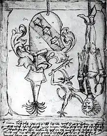- Rodolfo II da Varano (en), qui fit défaut à la papauté pendant la Guerre des Huit Saints, fut représenté pendu à un gibet attaché au cou d'un démon[20].