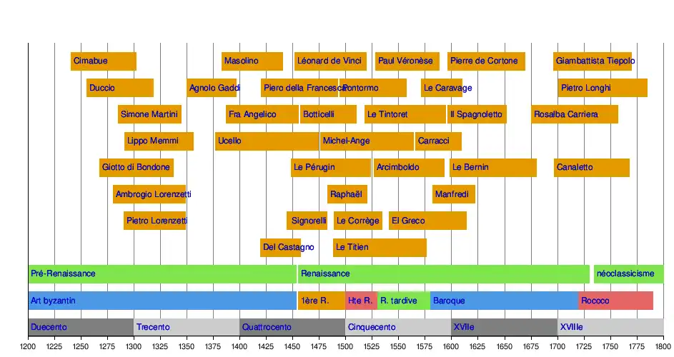 On distingue en général deux grandes périodes dans la Renaissance italienne. La première Renaissance, qui s'étend de 1400 à 1450, a pour capitale Florence et se caractérise par la volonté de se dégager des principes médiévaux pour revenir aux modèles antiques[48]. Les peintres majeurs de cette période ont pour nom Masaccio, Piero della Francesca, Le Verrocchio ou encore Fra Angelico. La seconde période est la haute Renaissance qui débute en 1450 pour finir en 1520, et se situe essentiellement à Rome. C'est l'époque des grands projets, des peintures monumentales et des chefs-d'œuvre produits par des artistes tels que Léonard de Vinci, Raphaël, Michel-Ange, Le Titien, Le Corrège ou Véronèse notamment[49].
