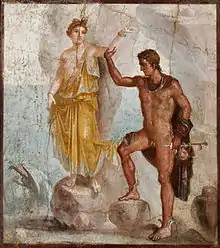 Contemporaine de l'art étrusque, la peinture romaine a également été fortement influencée par la peinture grecque antique, mais avec ses caractéristiques propres. Les seules peintures romaines qui ont survécu sont des peintures murales et des fresques, notamment dans des villas de la région de Campanie, dans le sud de l’Italie près de Naples, telles que les fresques de Pompeï, celles d'Herculanum, de Stabies ou d'Oplontis. La peinture romaine peut être regroupée en quatre catégories selon son style ou selon la période à laquelle elle a été réalisée[6], marquant l'évolution d'un style pictural initialement imprégné de l'empreinte grecque vers un style qui intègre les premiers exemples de trompe-l'œil, de pseudo-perspective et de paysage pur. Parmi les très rares peintures de portraits qui ont survécu on retrouve un grand nombre de portraits sur bois des momies du Fayoum datant de l’Antiquité tardive, entre la fin du Ier siècle av. J.-C. et la moitié du IIIe siècle. Par ailleurs, au IIIe siècle av. J.-C. un genre de peinture particulier apparaît, les peintures triomphales, qui retracent des épisodes de la guerre, les villes et les régions conquises et, bien qu'elles ont disparu aujourd'hui, leur existence est relatée par des témoignages littéraires [7],[8].