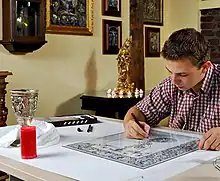 Dans le passé, on composait l'image à l'aide de différentes couches de couleurs, les contours étant préalablement peints à la peinture à l'eau ainsi que les ombres et lumières. Les aplats et les fonds, eux, étaient recouverts de peinture à l'œuf dite tempera ou à l'eau. De nos jours, la couleur à l'œuf est remplacée par la peinture à l'huile et la peinture à l'eau par la gouache, l'acrylique ou en mélangeant les pigments à des vernis.
