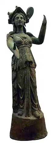 D'autres cultes sont pratiqués à Pella et connus par les statuettes et figurines de dieux qui ont été retrouvées : Athéna, avec l'épiclèse Alkidémos, est représentée non seulement avec le Gorgoneion traditionnel sur la poitrine mais aussi avec un casque orné de trois cornes de taureau (voir illustration ci-contre)[28]. Elle est une déesse protectrice des troupeaux. Dionysos et Pan sont également honorés à Pella[30].