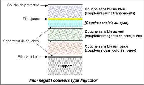 Chacune des trois couches principales comporte des grains de bromure d'argent sensibles à la lumière et un coupleur qui permettra de former un colorant au cours du développement chromogène. Lors de celui-ci, chaque coupleur réagit à proximité des grains d'argent exposés et libère un colorant de couleur complémentaire. Ces colorants sont toutefois insuffisamment sélectifs et « polluent » le rendu des autres couches :