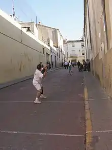 Traditionnellement, les parties se jouaient dans la rue. Chaque village avait une rue spécialement destinée au jeu. Cette rue devait être plane et avoir les dimensions approximatives d’un trinquet. Avec l’accroissement de la circulation automobile, il fut de plus en plus difficile d’y jouer. Aussi a-t-on vu se créer des rues artificielles spécialement destinées à la pratique de la pelote. On les appelle des « rues de la pelote » (carrer de la pilota). On y a reproduit tous les aspects d’une rue normale : fenêtres, balcon, portes, etc. On trouve ces fausses rues dans de nombreuses villes, en particulier à Monserrat, Torrent, Beniparrell, La Eliana, Meliana, Foyos, Albuixech, Xirivella, Calp ou Benidorm[1].