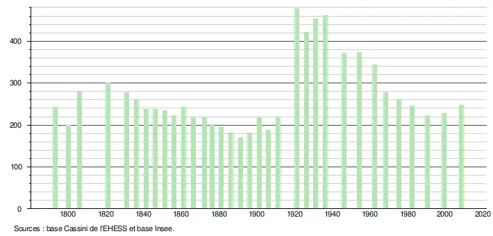 L'évolution du nombre d'habitants est connue à travers les recensements de la population effectués dans la commune depuis 1793. À partir du , les populations légales des communes sont publiées annuellement dans le cadre d'un recensement qui repose désormais sur une collecte d'information annuelle, concernant successivement tous les territoires communaux au cours d'une période de cinq ans. Pour les communes de moins de 10 000 habitants, une enquête de recensement portant sur toute la population est réalisée tous les cinq ans, les populations légales des années intermédiaires étant quant à elles estimées par interpolation ou extrapolation[7]. Pour la commune, le premier recensement exhaustif entrant dans le cadre du nouveau dispositif a été réalisé en 2008[8],[Note 2].