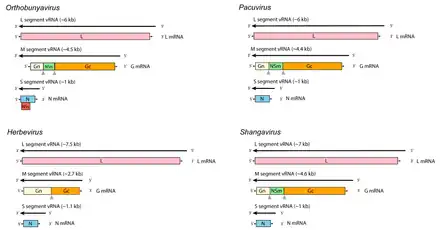 Génomes des orthobunyavirus, herbevirus, pacuvirus et shangavirus de la famille des Peribunyaviridae[3].