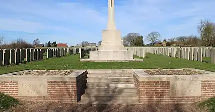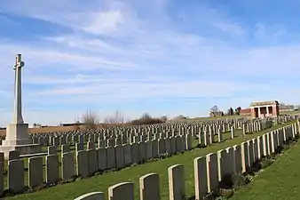 Il y a maintenant 1348 victimes de la guerre 1914-18 commémorées sur ce site. Parmi ceux-ci, 366 sont non identifiés et des monuments commémoratifs spéciaux sont érigés à 26 soldats du Royaume-Uni connus ou supposés être enterrés parmi eux. Le cimetière couvre une superficie de 3,7 ha et est entouré sur trois côtés par un muret de briques rouges.