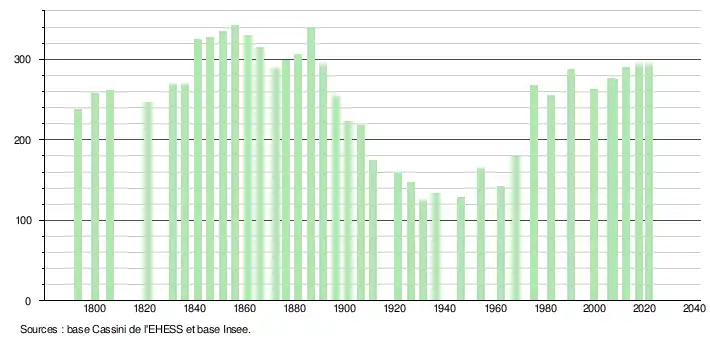 L'évolution du nombre d'habitants est connue à travers les recensements de la population effectués dans la commune depuis 1793. Pour les communes de moins de 10 000 habitants, une enquête de recensement portant sur toute la population est réalisée tous les cinq ans, les populations légales des années intermédiaires étant quant à elles estimées par interpolation ou extrapolation[14]. Pour la commune, le premier recensement exhaustif entrant dans le cadre du nouveau dispositif a été réalisé en 2007[15].