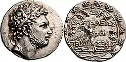 - Vers , il épouse Laodicé V, une fille de Séleucos IV Philopator et de Laodicé IV. Elle lui donne une fille, de prénom inconnu, et un fils, Alexandre, fait prisonnier par les Romains comme son père. Il apprend le latin et devient notaire[32]. Capturée par les Romains, Laodicé devient ensuite l'épouse d'Ariarathe V de Cappadoce.