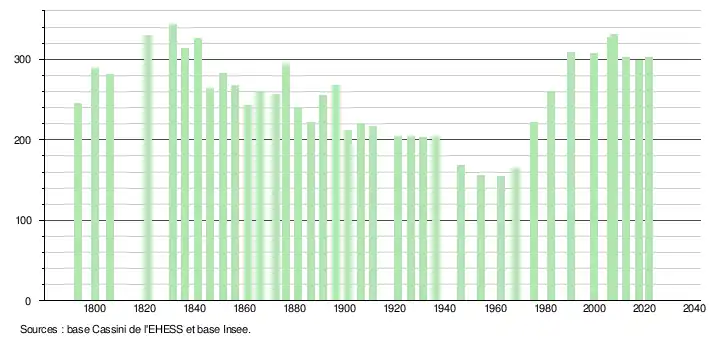 L'évolution du nombre d'habitants est connue à travers les recensements de la population effectués dans la commune depuis 1793. Pour les communes de moins de 10 000 habitants, une enquête de recensement portant sur toute la population est réalisée tous les cinq ans, les populations légales des années intermédiaires étant quant à elles estimées par interpolation ou extrapolation[16]. Pour la commune, le premier recensement exhaustif entrant dans le cadre du nouveau dispositif a été réalisé en 2007[17].